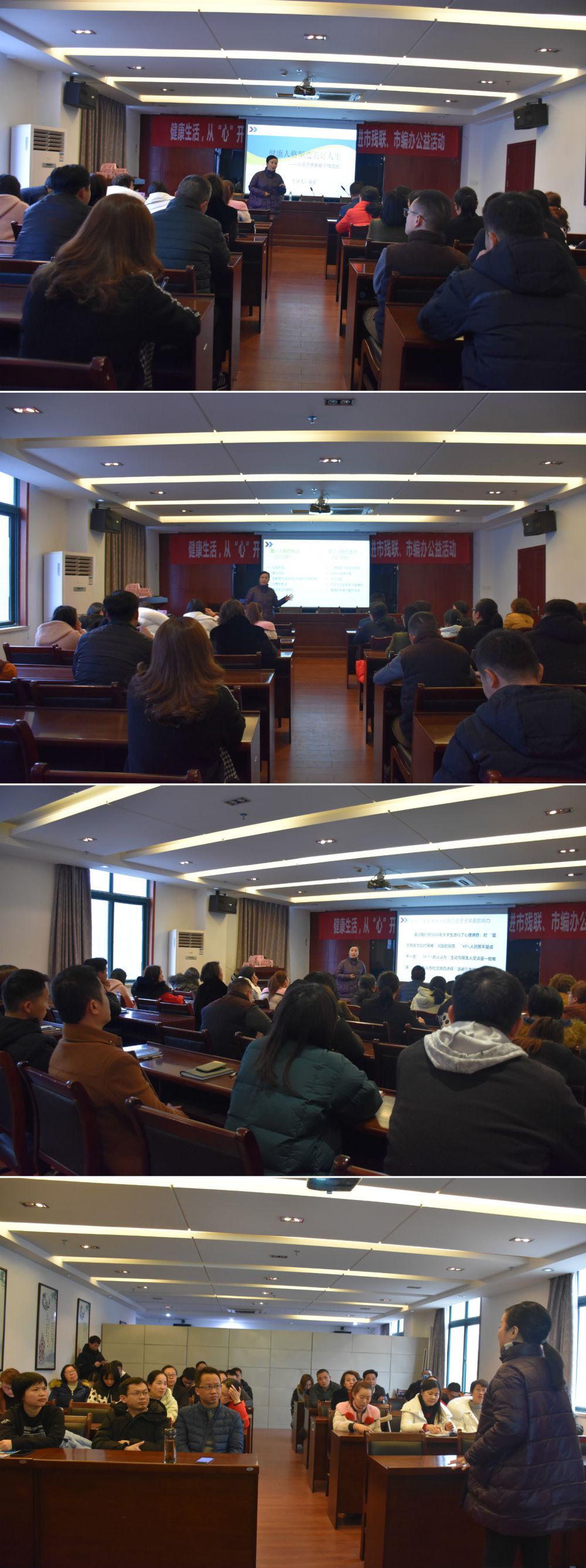 为深入贯彻习近平总书记“加强社会心理服务体系建设,培育自尊自信、理性平和、积极向上的社会心态”指示精神,提高我会干部职工阳光、健康、积极的心理素质,促进其快乐工作、和谐生活、全面发展,1月9日下午,市残联妇工委举办了健康生活,从“心”开始——幸福家庭成长计划公益讲座,邀请市政协委员、南昌静心社创始人、国家二级心理咨询师、2019年“三风榜样人物”陈虹老师以“亲子教育”为主题授课,会议由市残联工会主席舒丹主持。市残联机关各处室和下属单位共40余人参加。