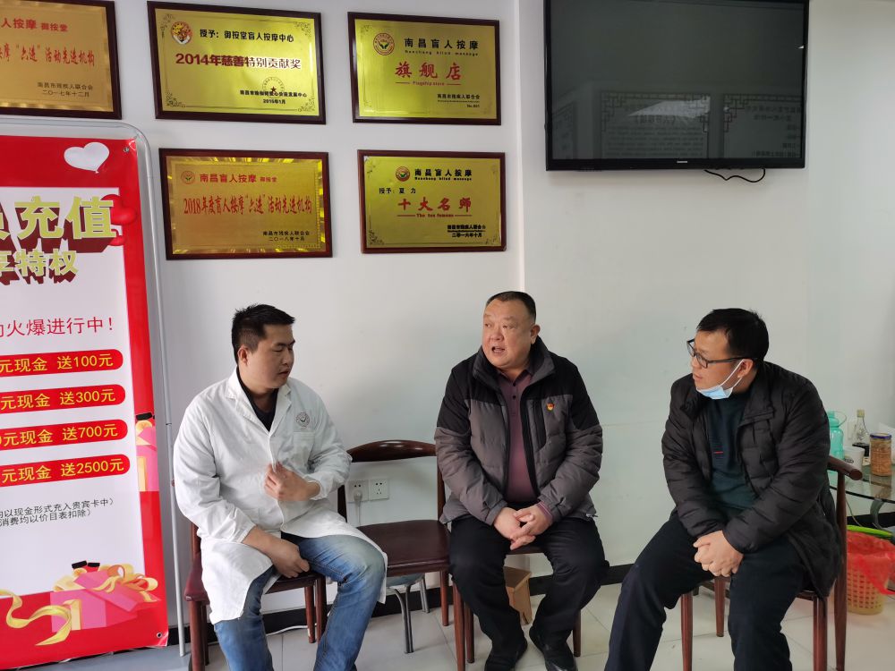 春节将至,为让我市广大盲人过一个安全祥和幸福的春节,掌握了解盲人按摩机构经营状况和面临的实际困难。1月19日下午,市残联四级调研员徐训波深入湾里和红谷滩走访调研“五统一”打造南昌(洪派)盲人按摩机构,市残联维权科、盲导中心负责人陪同走访。
