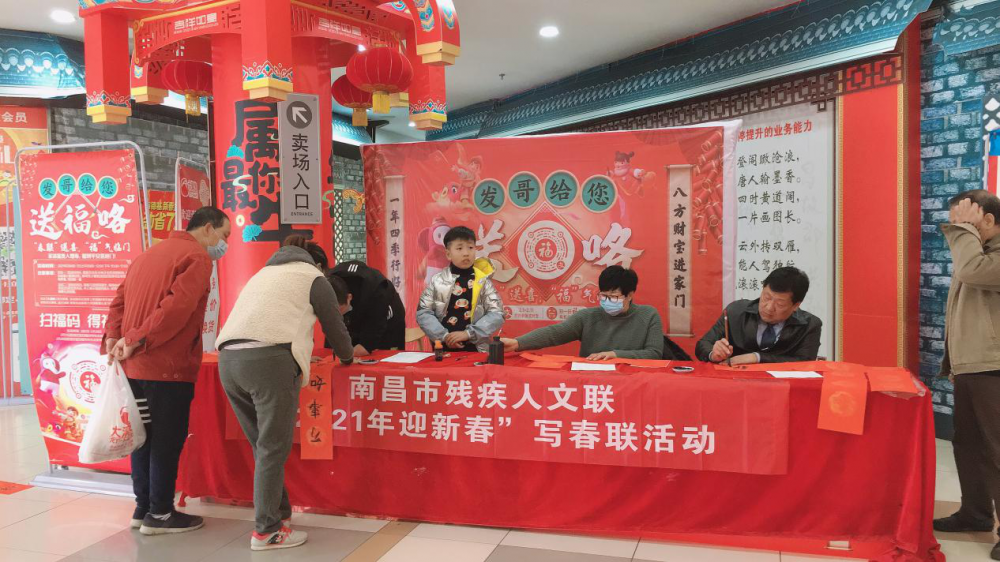 南昌市残疾人文联在春节前夕为社区、乡村、商场写春联,活跃节日气氛,已成了这几年春节期间,残疾人励志服务于社会,张扬残疾人文化自信的重要活动。
