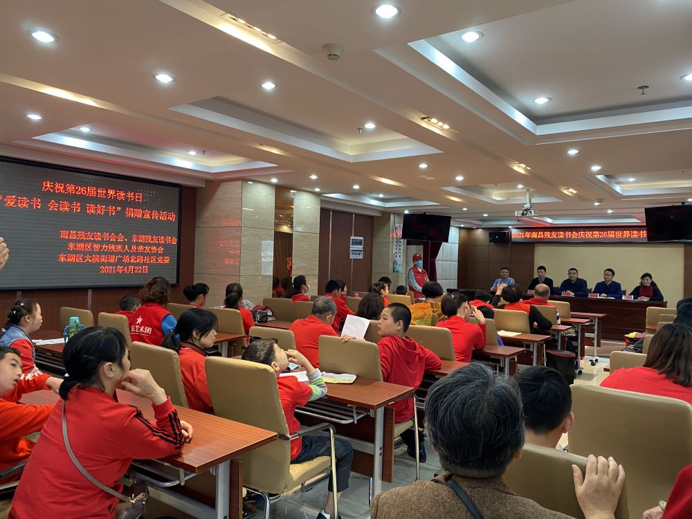 4月22号上午,在第26届“世界读书日”来临之际,由南昌残友读书会主办,东湖残友读书会、东湖区智力残疾人及亲友协会承办,东湖区大院街道广场北路社区党委协办的庆祝第26届“世界读书日”暨“爱读书、会读书、读好书”捐赠宣传活动在东湖区残疾人之家成功举行,南昌市残联党组成员、副理事长邓林和出席活动并讲话,南昌残友读书会会长雷拥军分享读书心得,东湖区残联理事长黄河致辞。区智力残疾人及亲友协会组织30名特殊儿童及其家长参加活动,大院街道广场北路社区党委组织8名助残志愿者为活动提供爱心志愿服务。