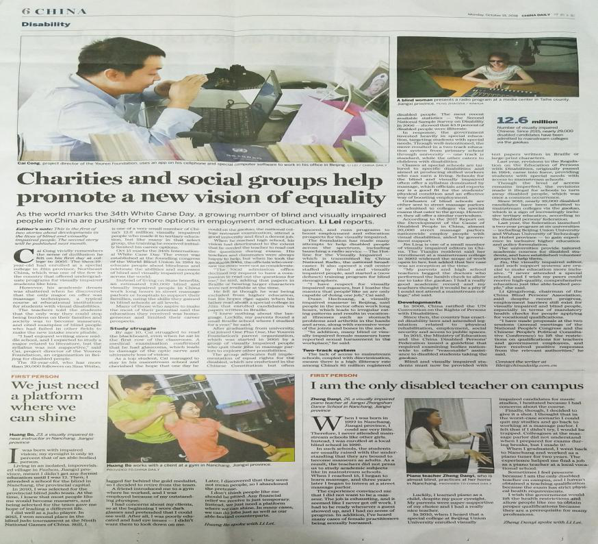2018年10月15日,是第35个国际盲人节。当日,《中国日报》海外版全英文关注南昌残疾人工作,用两篇文章分别报道南昌黄波、郑丹怡两位盲人朋友创新创业故事。此前,8月20日,《中国日报》海外版还特别关注南昌无障碍环境建设工作。获中央媒体用“洋文”关注残疾人工作,这在南昌残联30年历史中尚属首次。(组宣处 宋明进)
