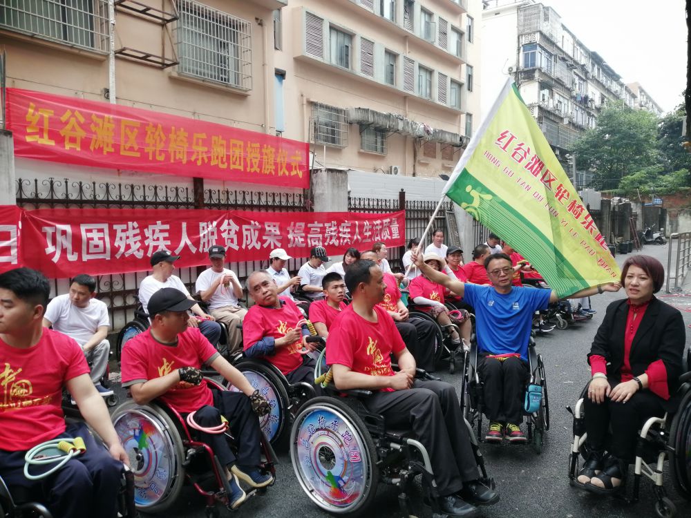南昌市轮椅乐跑团王乐秋主席向红谷滩区残联代表授旗。乐跑团成员表演了拉力操和“怒放的生命”舞蹈。