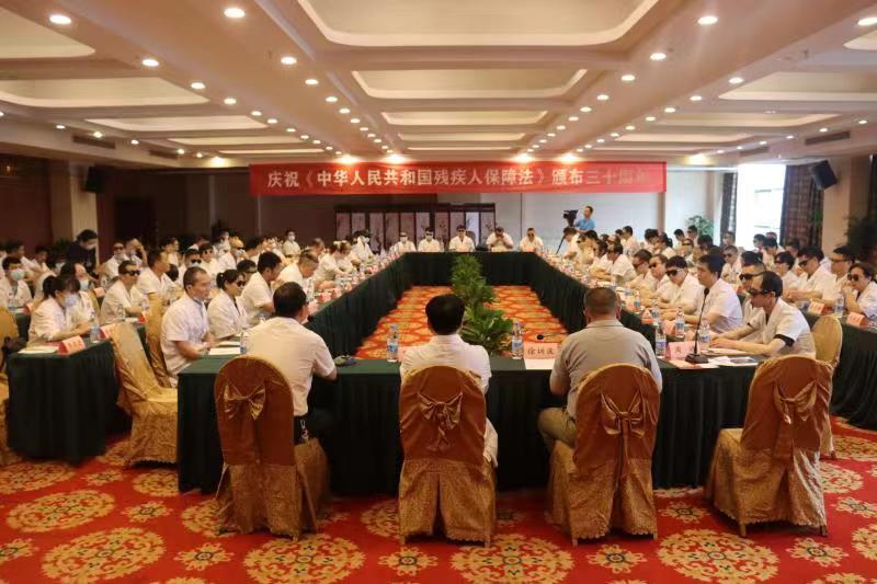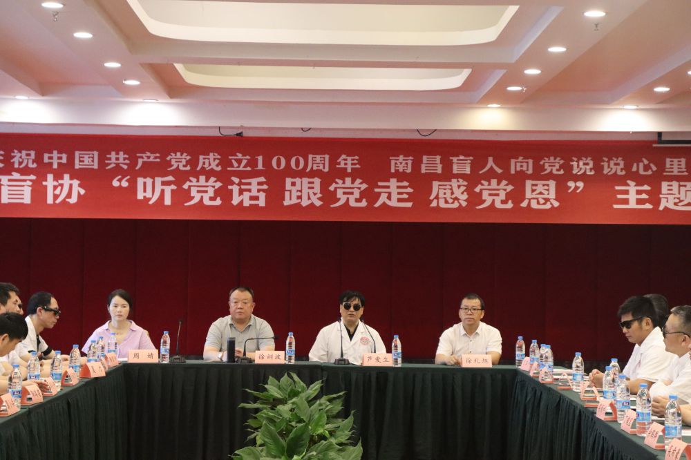 5月26日上午,南昌市盲协在红谷滩新吉花园酒店召开“听党话 跟党走 感党恩”主题座谈会,庆祝中国共产党建党100周年及《中华人民共和国残疾人保障法》颁布30周年。 市残联四级调研员徐训波、市残联理事、盲协主席芦爱生出席座谈会,市、县区盲协成员、“五统一”机构代表、市盲人按摩指导中心有关人员共 110余人参加座谈,座谈会由市盲协主席芦爱生主持。