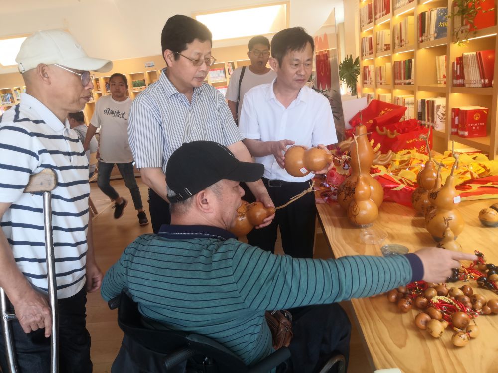 新建区残联联合新华书店在新建区心怡广场的抱朴书屋举办一场“扶残助残、爱心传递——残疾艺人工艺作品展”,南昌市残联副理事长林善岳和新建区残联理事长罗水根参加活动展出。