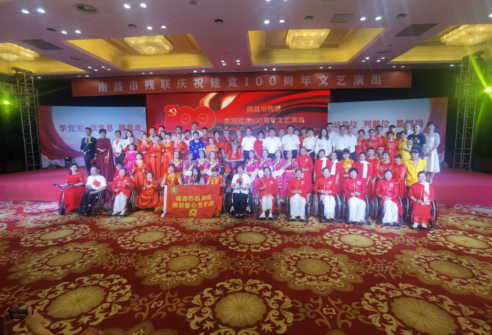 伴随着铿锵的锣鼓声,6月27日,全市残联系统“学党史、颂党恩、跟党走——庆祝建党100周年”残疾人文艺演出在滨江宾馆大会堂隆重举行。来自全市的各残疾人艺术团,以精心编排的精彩节目向中国共产党百年华诞献上最真挚美好的祝福。市残联党组书记、理事长余颖,市残联副理事长吴卫平、林善岳、邓林和及四级调研员徐训波出席活动。各县区、开发区和湾里管理局残联理事长,市残疾人五大专门协会的主席、副主席参加活动。此次演出活动还同步进行了全网直播,直播浏览量近258万人次。