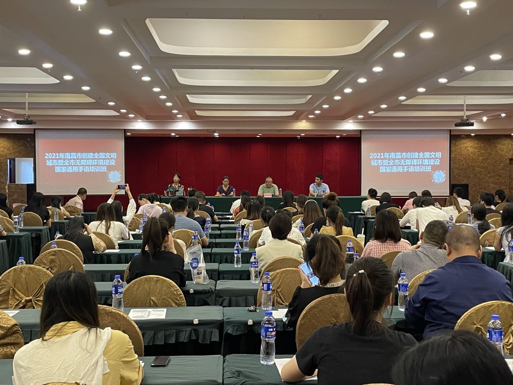 为进一步提升我市无障碍环境建设,落实文明城市创建中对听力残疾人提供信息无障碍服务的要求,围绕“我为群众办实事”主题实践活动,提高我市各公共政务服务窗口为聋人手语服务水平。7月7日至8日,市残联在新吉花园酒店举办了为期2天的南昌市创建全国文明城市暨全市无障碍环境建设国家通用手语培训班,培训班邀请了市聋协主席胡晓芸、市启音学校曾文萍两位老师进行授课。各县区(开发区)、湾里管理局,市直有关单位,部分乡镇、街办、管理处,部分银行、商场、宾馆、医院、地铁等单位政务窗口一线工作岗位人员130余人参加了培训,市残联四级调研员徐训波作了开班动员讲话。