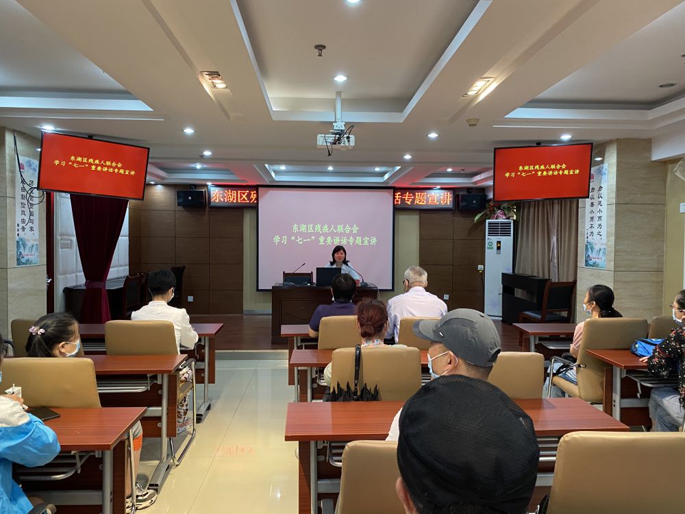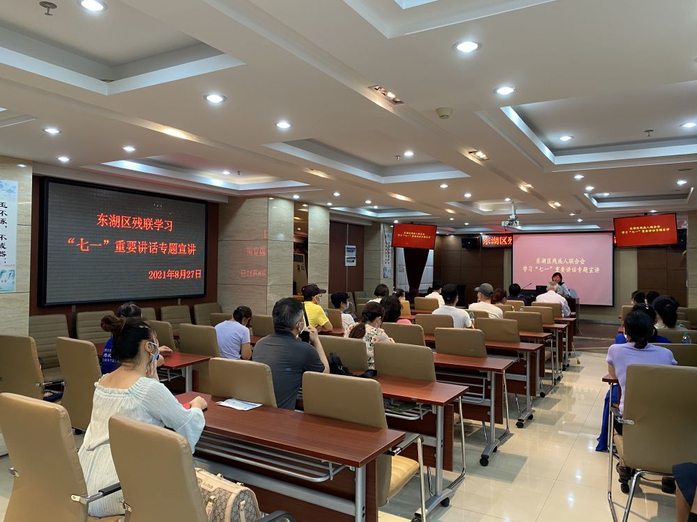 8月27日上午,东湖区残联学习“七一”重要讲话专题宣讲暨“五大”残疾人专门协会系列主题活动在区残疾人之家举行。区残联副理事长曹蜓作专题宣讲,区“五大”残疾人专门协会组织各类残疾人50余人到场聆听。