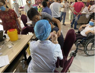 9月6日上午区卫健委专门派出一支医疗小组来到南昌市福利院,由福利院及街道、社区工作人员组织所有能够接种疫苗的残疾人进行有序接种。现场分为等待区、接种区、留观区。在现场街道及社区干部协助福利院的工作人员为残疾人进行登记,做好咨询服务,维护现场秩序,并引导打完疫苗的残疾人到留观区进行观察。区卫健委的医护人员热心、仔细地为残疾人及福利院的工作人员讲解接种新冠疫苗禁忌证及注意事项,为给符合条件的残疾人接种新冠疫苗