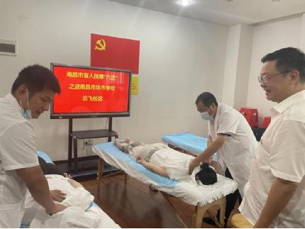 南昌盲人按摩圣康盲人按摩院是西湖区残联2020年打造的“五统一”盲人按摩航母旗舰店。活动中,西湖区残联专门邀请了4名专业盲人按摩技师为在校老师提供理疗义诊、推拿按摩、健康咨询等志愿服务,为展现西湖区盲人按摩从业人员自立自强,以“一技之长,服务大众”,宣传“南昌盲人按摩”品牌,推广健康生活理念达成积极的促进成效。