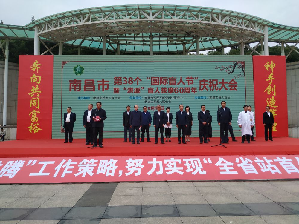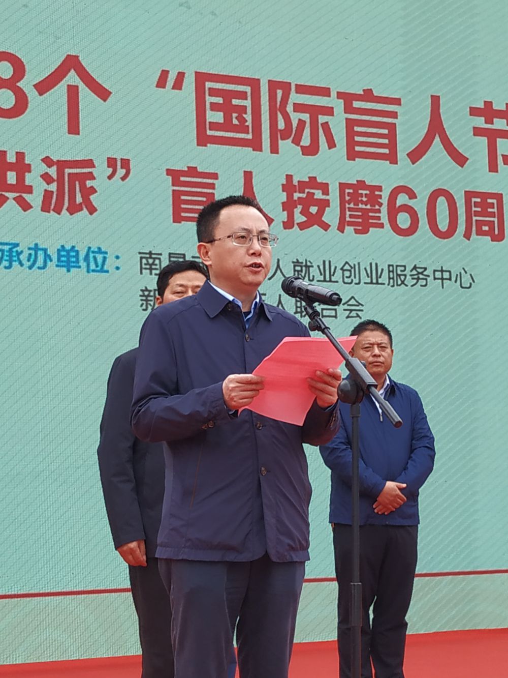 为庆祝第38个“国际盲人节”暨南昌(洪派)盲人按摩成立60周年,进一步丰富广大盲人朋友的精神文化生活,提升残疾人改善自身状况和适应社会生活的能力,让更多残疾人走出家门、融入社会。10月15日上午,市残联在新建区长堎镇心怡广场举办了以“奔向共同富裕 神手创造辉煌”为主题的庆祝活动,市政府副秘书长王小文出席启动仪式,市残联党组书记、理事长余颖出席活动并讲话,新建区常务副区长李葵,市残联副理事长吴卫平、邓林和,四级调研员徐训波出席活动,活动由市残联副理事长林善岳主持。
