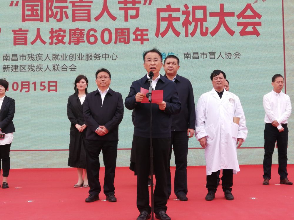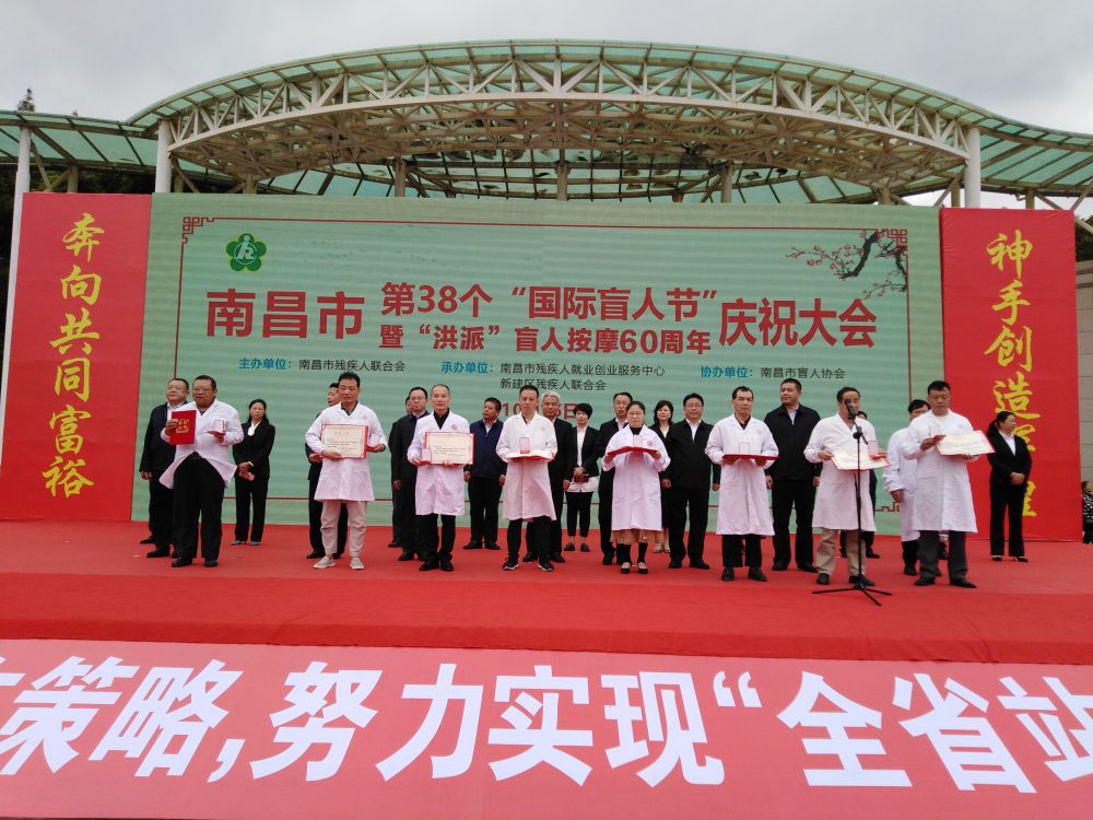 新建区常务副区长李葵致辞,青年盲人创业代表曹兵,市残联理事、市盲协主席芦爱生作了发言。省、市领导向从事盲人按摩行业三十年按摩大师代表授予南昌(洪派)盲人按摩成立60周年纪念章和荣誉证书。