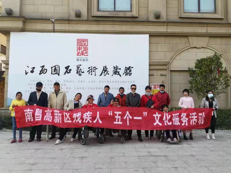 25日上午,在工作人员的协助下,残友们陆续登上大巴车,前往活动第一站高新区图书馆,通过阅读书籍,残友们深刻认识到爱读书、读好书、善读书是一个人的内涵、修养和文明素质的重要体现。第二站,残友们来到鱼尾洲公园,在公园里,残友们晒着秋天的暖阳,欣赏着美丽的公园秋景,放松身心。第三站,残友们来到江西国石艺术展览馆,简单了解石雕、木雕、陶瓷、文房四宝等艺术品的制作及收藏价值。第四站,残友们观看了红色电影《长津湖》,通过观看剧情残友们深受感动,深切体会到没有先辈们的浴血奋战就没有我们现在的美好生活,牢固树立了要铭记历史的思想信念。