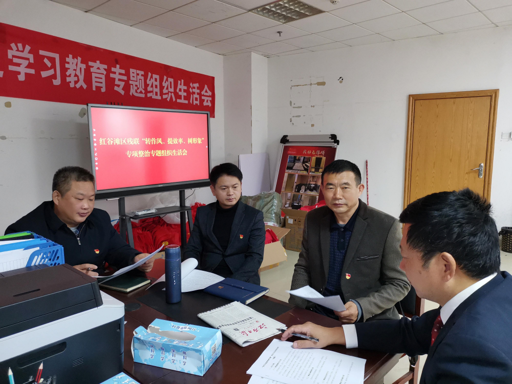 根据《关于在区直机关基层党组织中召开“转作风 提效率 树形象”专项整治专题组织生活会的通知》(红谷组【2021】51号)要求,为贯彻落实《中共南昌市委办公室、南昌市人民政府办公室印发<关于在全市机关开展转作风 提效率 树形象专项整治的实施方案〉的通知》(红谷办发【2021】87号)精神,区残联机关支部于2021年10月22日下午召开“转作风、提效率、树形象”专项整治专题组织生活会。