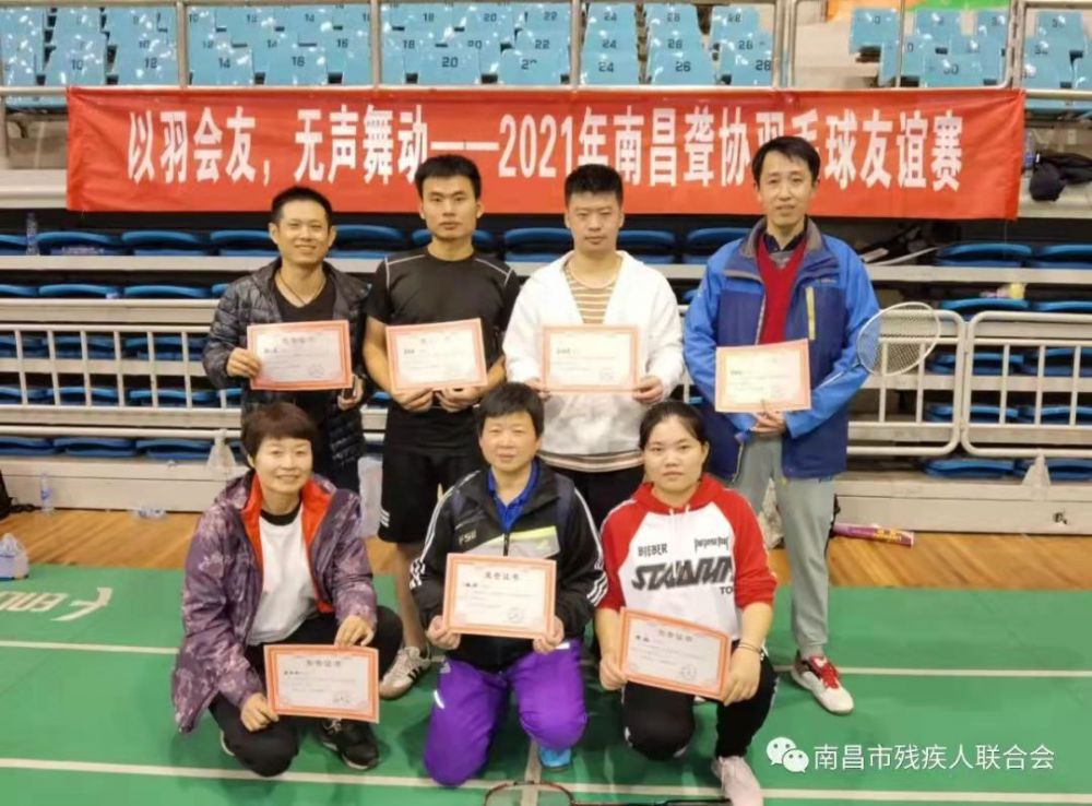 经过近四小时比赛,男子组名次前四名为:第一名彭怡东、第二名邬小军、第三名胡方玮、第四名李焕秋;女子组前三名名次为:第一名丁晓玲、第二名张亚红、第三名熊颖,市聋协胡晓云主席为以上选手颁发了证书。这次选拔赛充分展现了南昌聋人羽毛球爱好者顽强拼搏的精神!运动使人健康,交流使人成长,增强了体质,扩大了交友范围,延展了生命的宽度,锻炼了顽强不息和乐观进取的精神风貌!