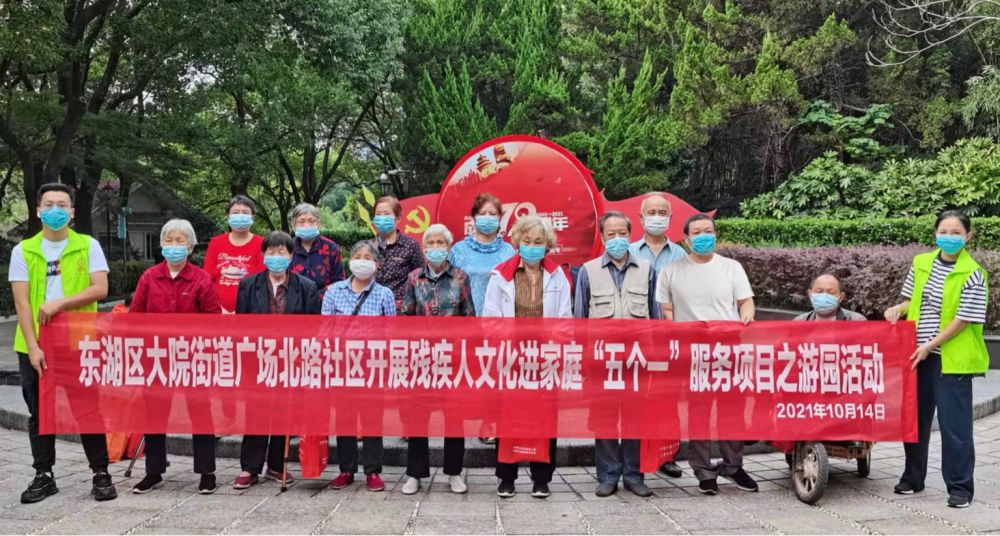 为进一步丰富残疾人文化生活,满足残疾人精神文化需求,让更多残疾人朋友能够自信的走出家门、融入社会,10月14日,东湖区大院街道广场北路社区残协开展残疾人文化进家庭“五个一”游园活动,15名残疾人在社区干部和志愿者的帮助下畅游人民公园。