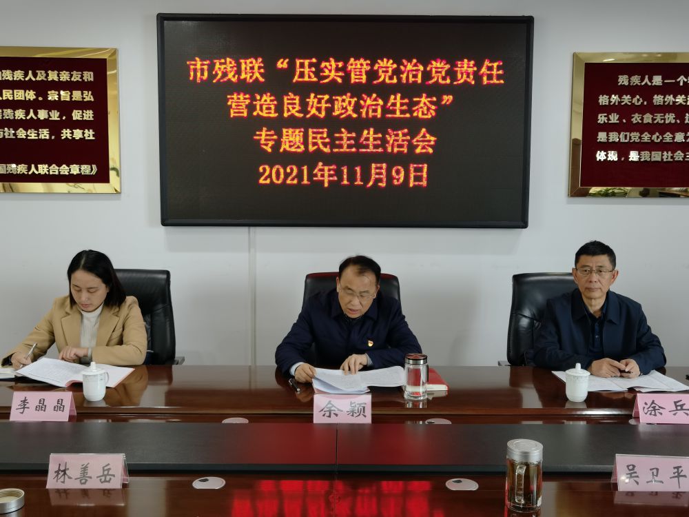 按照市委统一部署,11月9日下午,南昌市残联党组召开“压实管党治党责任 营造良好政治生态”专题民主生活会。市残联党组书记、理事长余颖主持会议,党组成员、副理事长吴卫平、林善岳、邓林和参加会议。第八巡回督导组副组长涂兵到会指导。