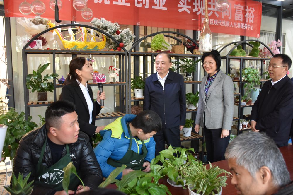 在西湖区现代残疾人托养中心,何剑锋、钱昀详细了解了中心的日常管理、残疾人康复治疗及生活情况,并前往秋艺花卉坊、爱的智皂坊、烘焙训练室等查看残疾人庇护性劳动、辅助性就业情况。
