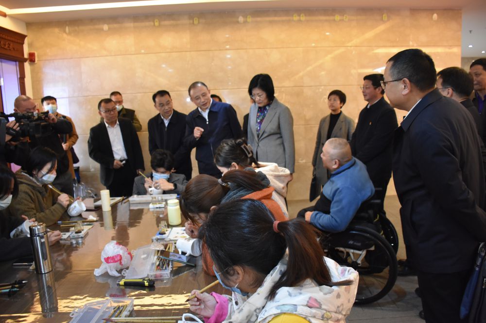 在南昌市残疾人就业创业孵化基地,何剑锋、钱昀听取了基地相关情况介绍,饶有兴趣地了解了进贤县的文港毛笔、南昌县的昌南丝网花、青云谱区的南昌瓷板画、经开区的网络直播等“一县一品”残疾人就业创业情况,现场观摩了残疾人艺术大师和爱好者进行作品创作,并与在场的残疾朋友亲切交谈了解就业及收入情况,勉励他们刻苦钻研技能,努力创作精品,展现残疾人良好的艺术情操和精神风貌。