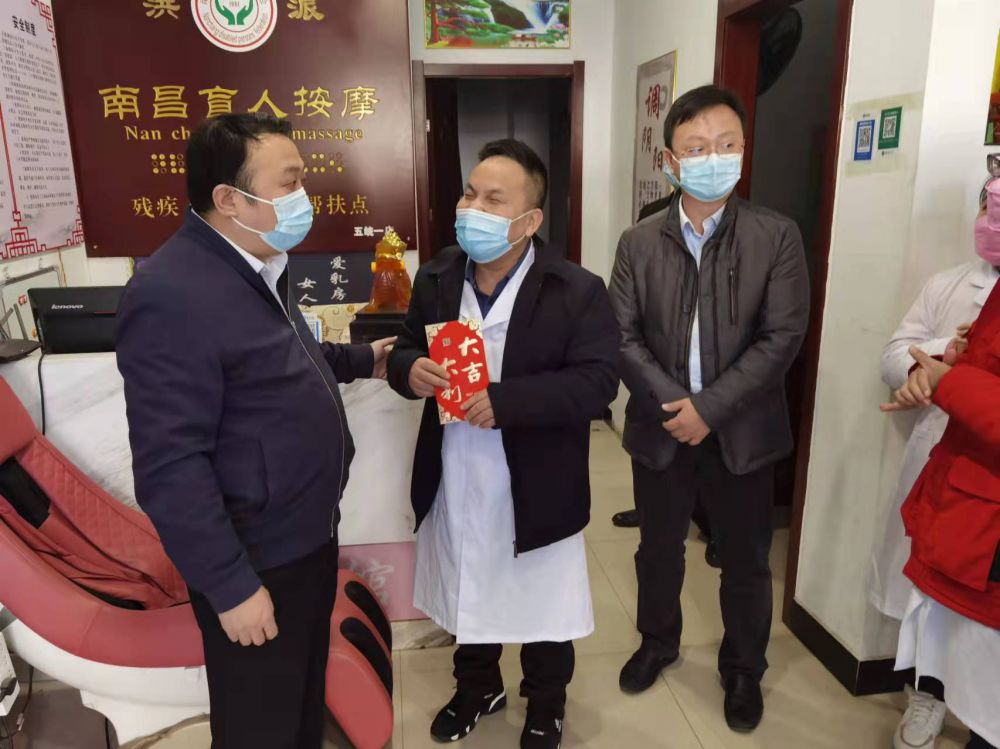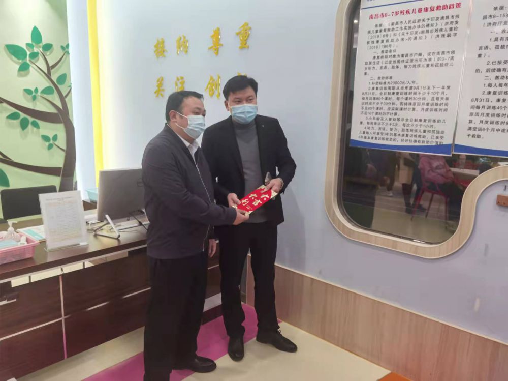 夏辉一行先后走访了青云谱区柏润儿童行为康复训练中心、洪派国太盲人按摩店,2家扶残助残机构向助残机构送去节日的问候和慰问金,并向助残服务机构所做出的社会贡献表示感谢。
