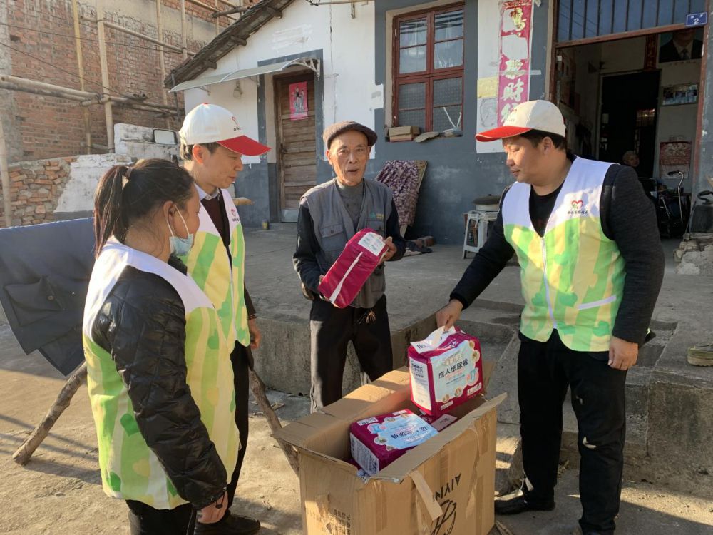 志愿者正在向残疾人家庭赠送轮椅、尿不湿等物资