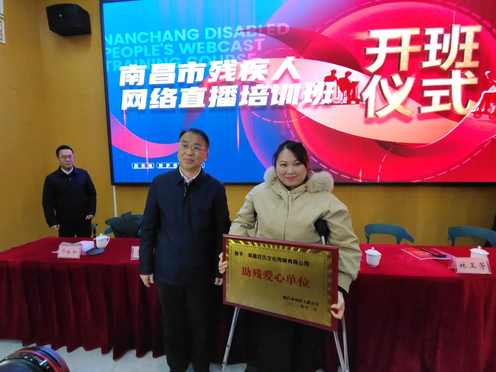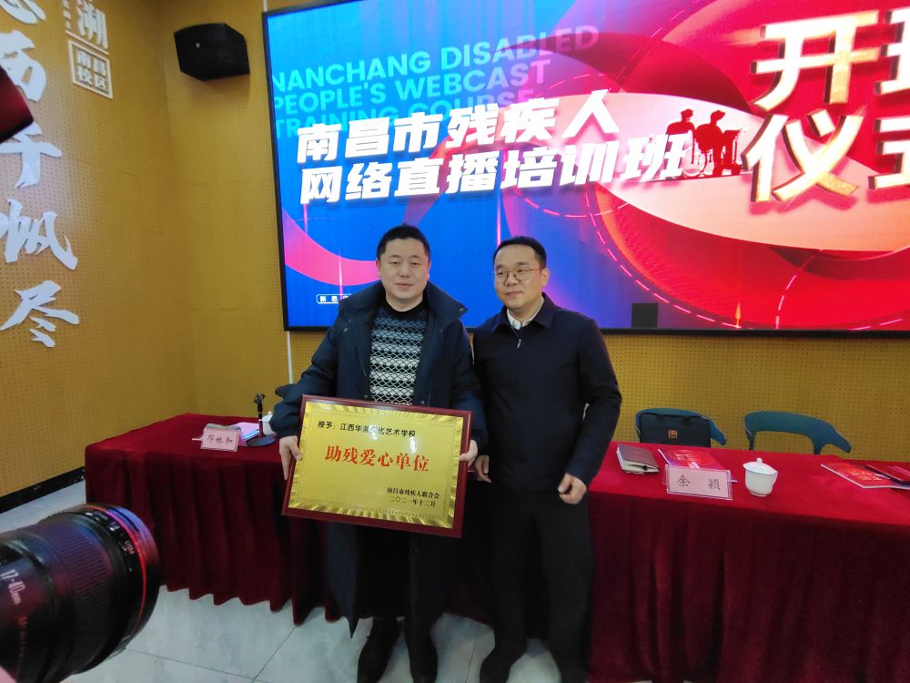 开班式上,兰昊、余颖为南昌华溯艺校、南昌百氏文化传媒有限公司颁发了“助残爱心单位”牌匾。