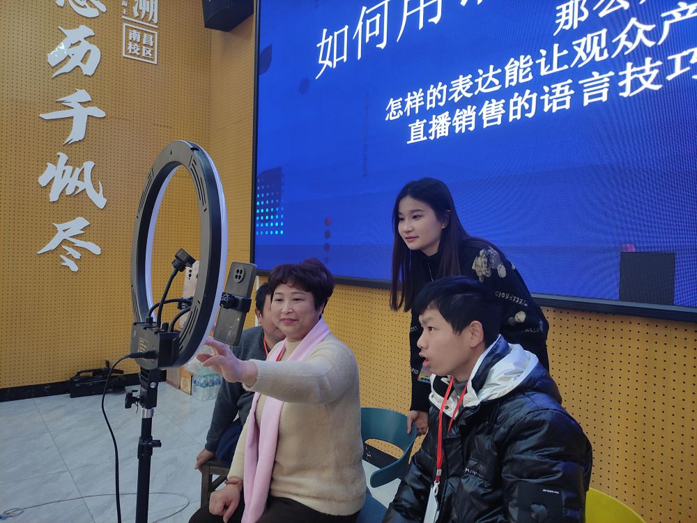 当日下午,马群讲师给学员们进行A、B两组的分组。A组对从不太了解网络直播新型行业知识的学员进行培训;B组对有一定基础的学员进行初步的实操演练。在实践教学中,讲师请学员上台配合,演示、讲解直播时介绍产品的方式方法和话语话术。