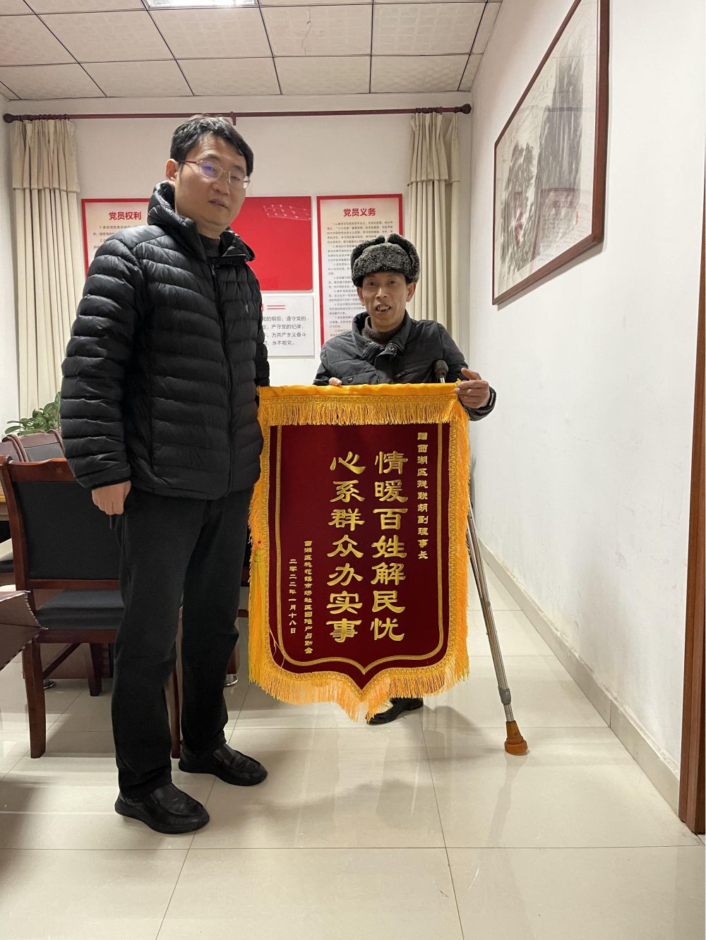 为了表达对“娘家人”的浓浓感恩之情,2022年1月17日,西湖区残联副理事长胡翔收到辖区困难残疾人专程送来的爱心锦旗。