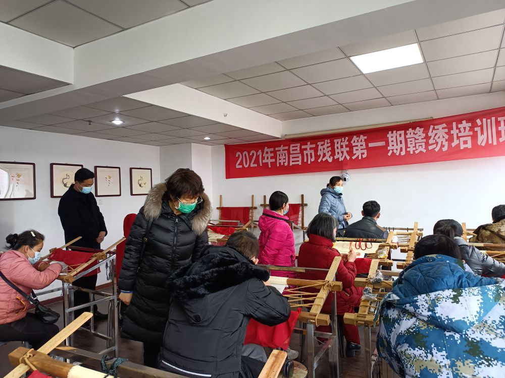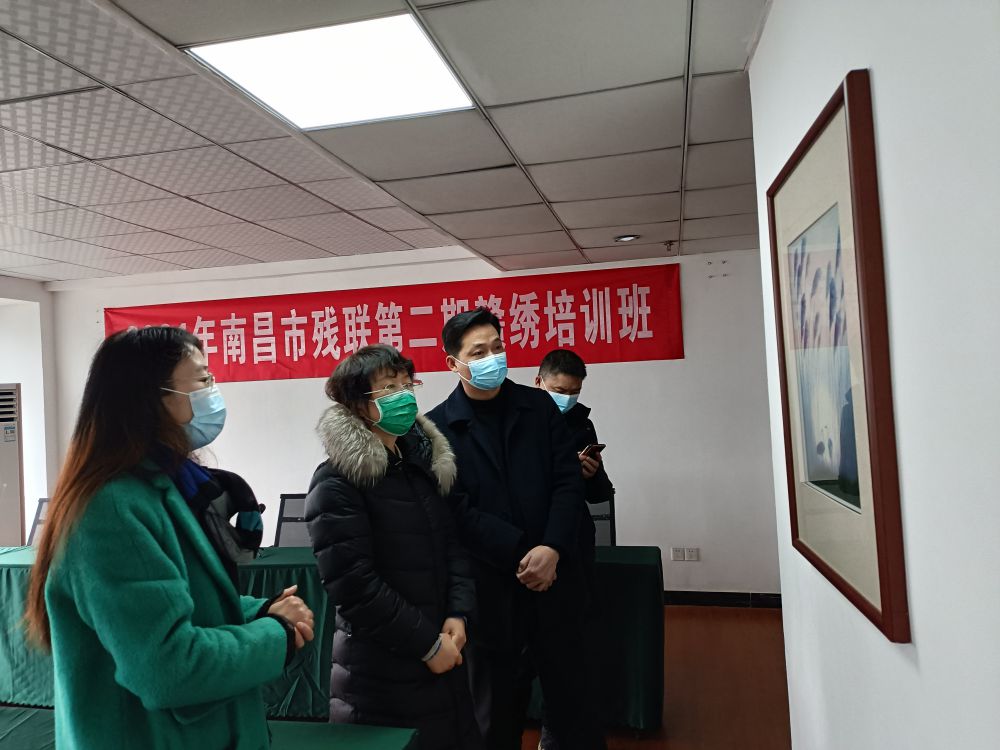工作人员先后来到非物质文化遗产“赣绣”第一期、第二期培训班教室,听取了培训机构负责人对“赣绣”培训项目近期开展情况的介绍,查看了全体学员的动态行程卡,查验了疫情防控的物资储备及教学工具的消毒情况,并与培训学员进行亲切交流,了解他们的学习及生活情况,并向全体学员致以新年祝福,希望他们在2022年身体健康、学业有成。