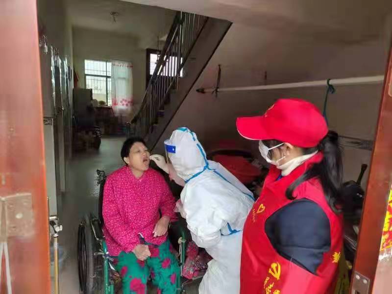麻丘镇残联通过电话、微信等方式对辖区内所有残疾人进行摸排、沟通和核对,准确掌握残疾人基本信息,确定人员名单,确保一个不漏,在工作人员的带领下,医护人员来到新龙村熊某的家中,她坐轮椅多年,去集中检测点极为不便,在进行信息登记后,为她进行并完成核酸检测。熊某和她的家人激动地说“你们太辛苦了,做得很周到,真是太感谢了!”。