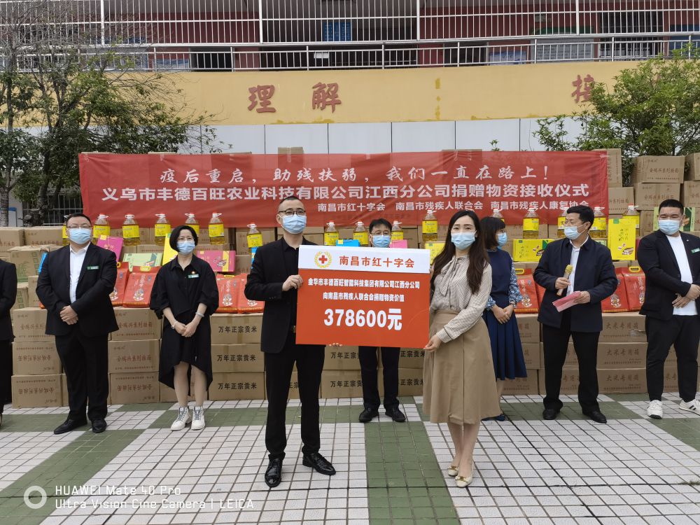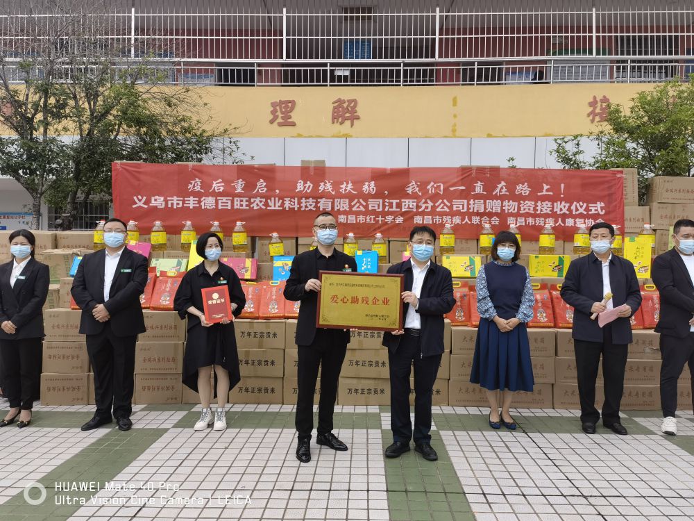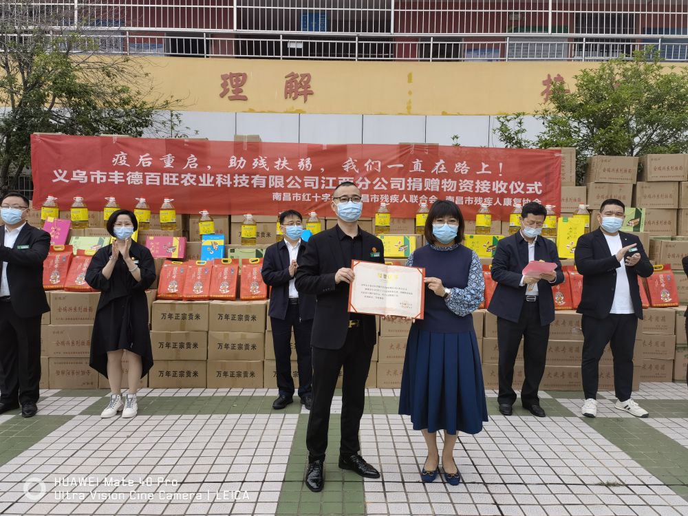 5月21日上午,金华市丰德百旺智能科技集团有限公司江西分公司捐赠物资接收仪式在南昌市西湖区现代残疾人托养服务中心举行。市残联党组成员、副理事长吴卫平,市红十字会党组成员、副会长侯正,金华市丰德百旺智能科技集团有限公司江西分公司总经理刘春炉等出席仪式,市残联党组成员、副理事长林善岳主持仪式。