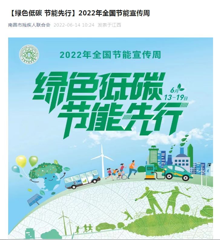 为落实党中央、国务院关于碳达峰碳中和决策部署,传播节能降碳和绿色发展理念,全国第32个节能宣传周于2022年6月13正式启动。市残联根据市公节办方案要求,在疫情防控常态化的背景下,以线上、线下相结合的方式,围绕“绿色低碳,节能先行”的活动主题开展了形式各样、内容丰富的节能宣传活动。