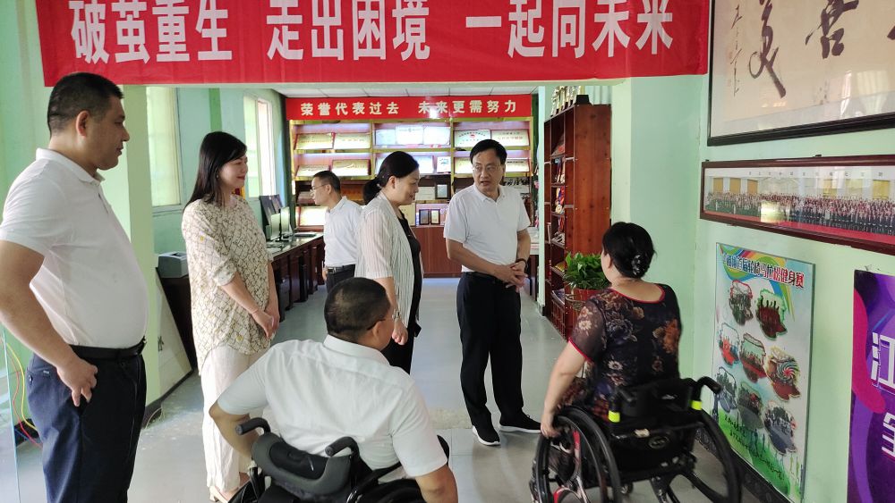 领导们参观了南昌市脊髓损伤者希望之家的荣誉室、功能训练房和“美丽工坊”手工作品展览室;共同为由南昌市残联选送、获得江西省首届残疾人排舞操云大赛轮椅公开组第一名的《我依然奔跑在路上》的全体参舞人员颁发获奖证书。